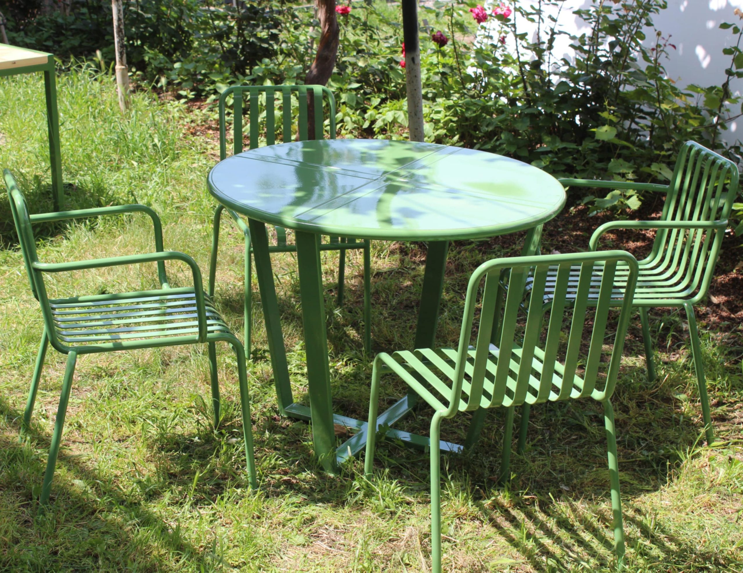მაგიდა №4 თავის დიამეტრი 90სმ ფხვნილოვანნი საღებავით დამუშავებული ლითონის კონსტრუქცია.